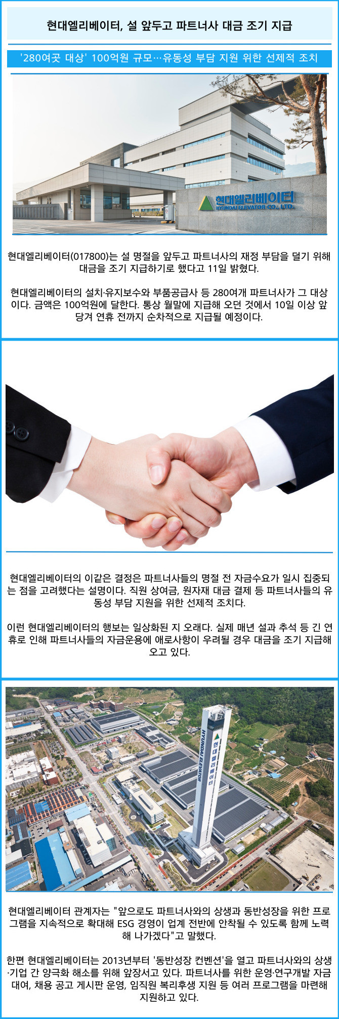 [프라임경제] 현대엘리베이터(017800)는 설 명절을 앞두고 파트너사의 재정 부담을 덜기 위해 대금을 조기 지급하기로 했다고 11일 밝혔다.