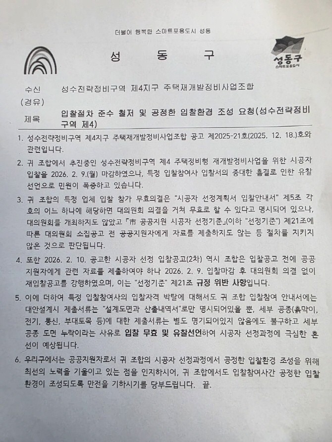 성동구청은 11일 성수전략정비구역 제4지구 주택재개발정비사업조합(이하 조합)에 '입찰절차 준수 철저 및 공정한 입찰환경 조성 요청' 공문을 발송하고, 조합과 입찰 참여사 간 원만한 합의를 권고했다. 형식상 행정지도지만, 구체적 절차상 문제들이 적시됐다는 점에서 사실상 '조합 의사결정 과정 전반에 대한 점검 성격을 띠고 있다'라는 게 업계 시선이다.