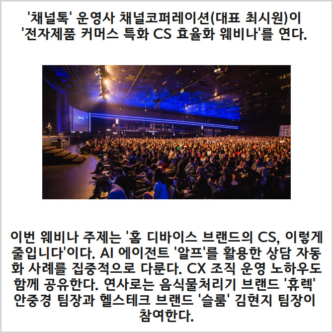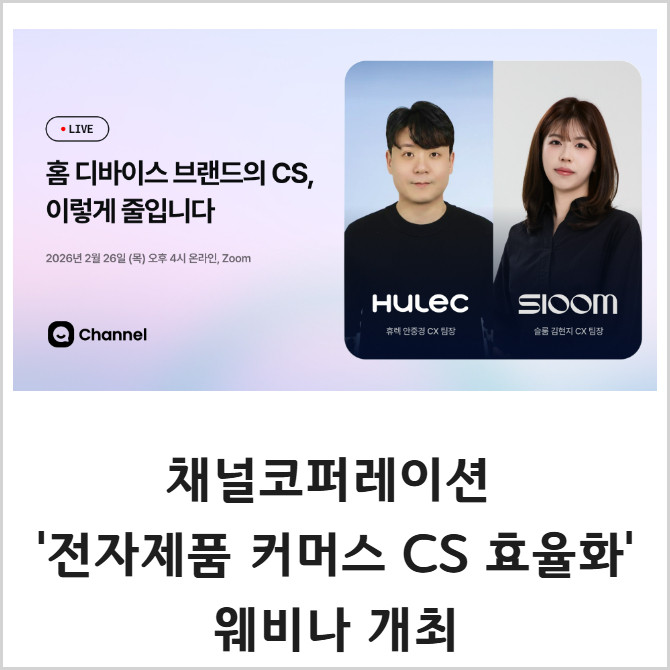 [프라임경제] '채널톡' 운영사 채널코퍼레이션(대표 최시원)이 '전자제품 커머스 특화 CS 효율화 웨비나'를 오는 26일 개최한다고 12일 밝혔다.