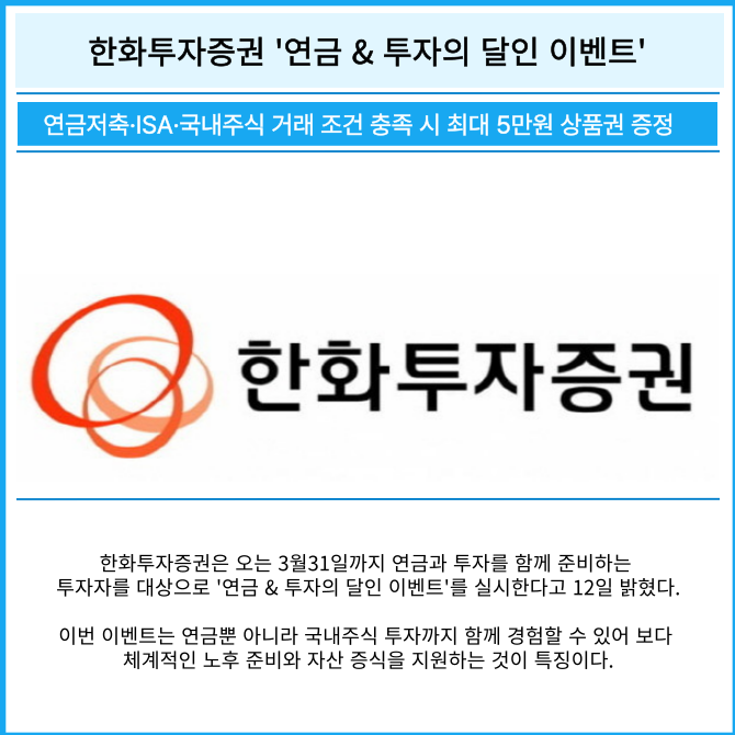 [프라임경제] 한화투자증권은 오는 3월31일까지 연금과 투자를 함께 준비하는 투자자를 대상으로 '연금 & 투자의 달인 이벤트'를 실시한다고 12일 밝혔다.