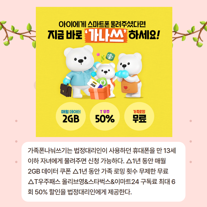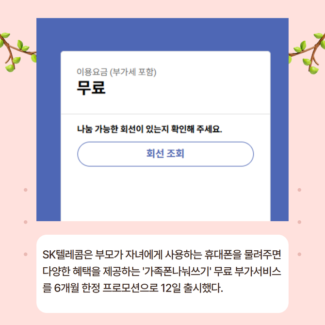 [프라임경제] SK텔레콤(017670)은 부모가 자녀에게 사용하는 휴대폰을 물려주면 다양한 혜택을 제공하는 '가족폰나눠쓰기' 무료 부가서비스를 6개월 한정 프로모션으로 12일 출시했다고 밝혔다.