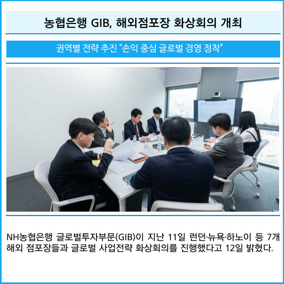 [프라임경제] NH농협은행 글로벌투자부문(GIB)이 지난 11일 런던·뉴욕·하노이 등 7개 해외 점포장들과 글로벌 사업전략 화상회의를 진행했다고 12일 밝혔다.