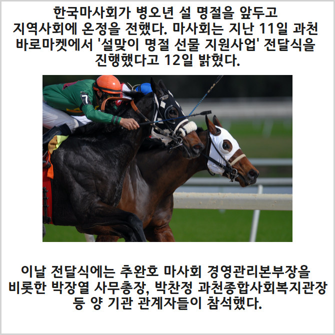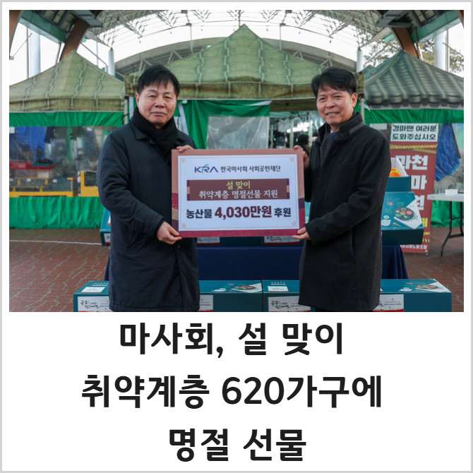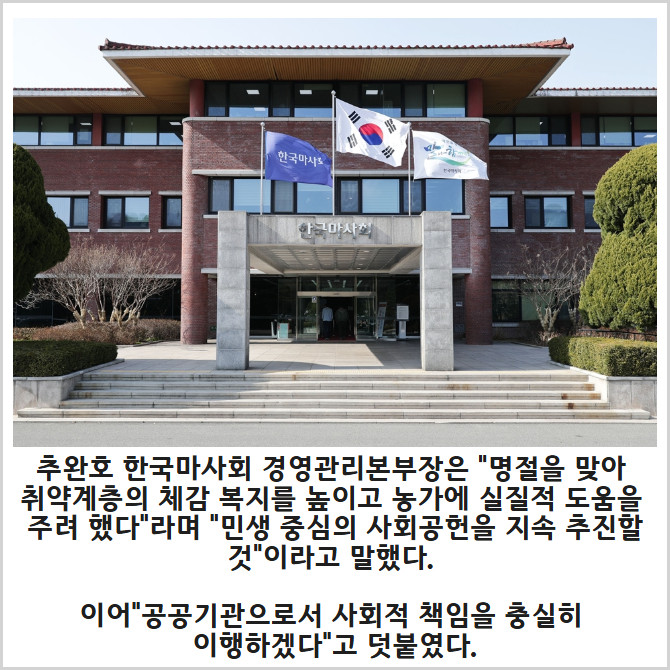 [프라임경제] 한국마사회(회장 우희종)가 병오년 설 명절을 앞두고 지역사회에 온정을 전했다. 마사회는 지난 11일 과천 바로마켓에서 '설맞이 명절 선물 지원사업' 전달식을 진행했다고 12일 밝혔다.