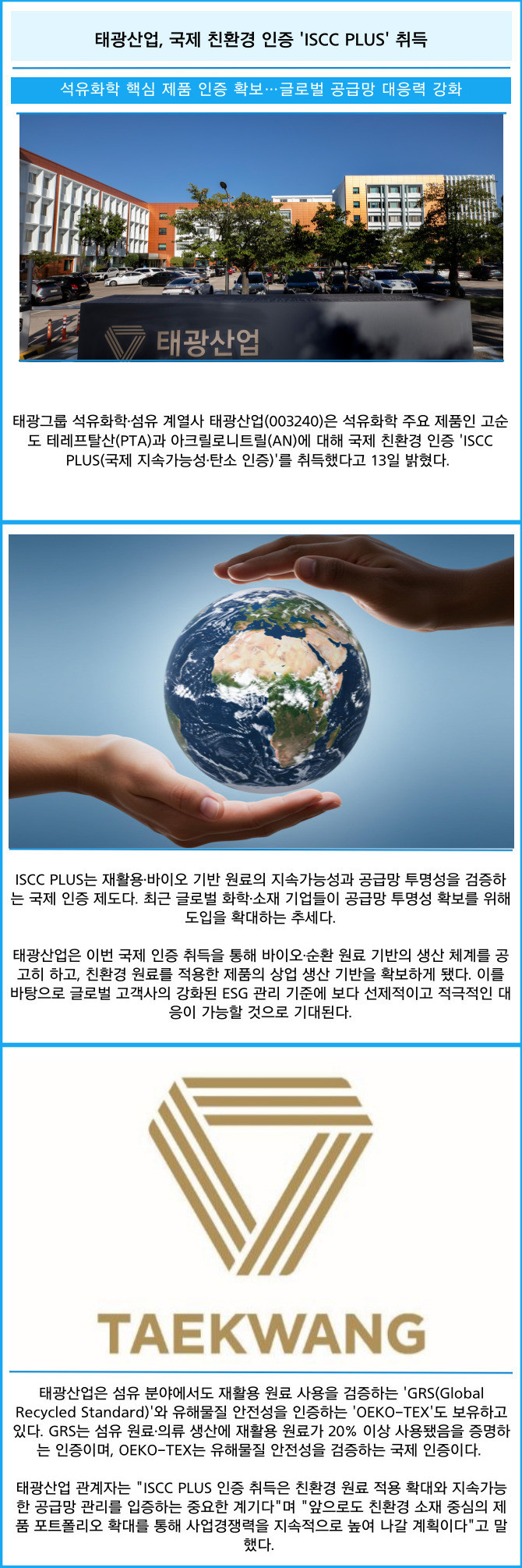 [프라임경제] 태광그룹 석유화학·섬유 계열사 태광산업(003240)은 석유화학 주요 제품인 고순도 테레프탈산(PTA)과 아크릴로니트릴(AN)에 대해 국제 친환경 인증 'ISCC PLUS(국제 지속가능성·탄소 인증)'를 취득했다고 13일 밝혔다.