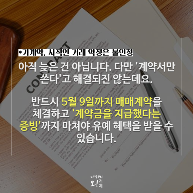 다만 시장 충격을 완화하기 위해 5월 9일까지 매매계약을 체결하고 계약금을 지급한 경우에 한해 중과 배제 혜택을 인정하기로 했다.
