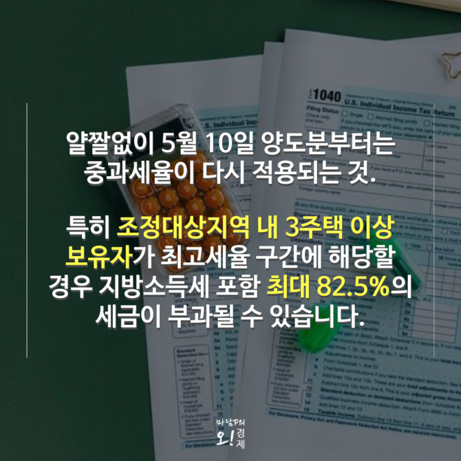 [프라임경제] 정부가 다주택자에 대한 양도소득세 중과 유예 조치를 예정대로 오는 5월 9일 종료한다. 이에 따라 5월 10일 이후 양도분부터는 규제지역 내 다주택자에게 최고 82.5%(지방세 포함)의 중과세율이 다시 적용된다.