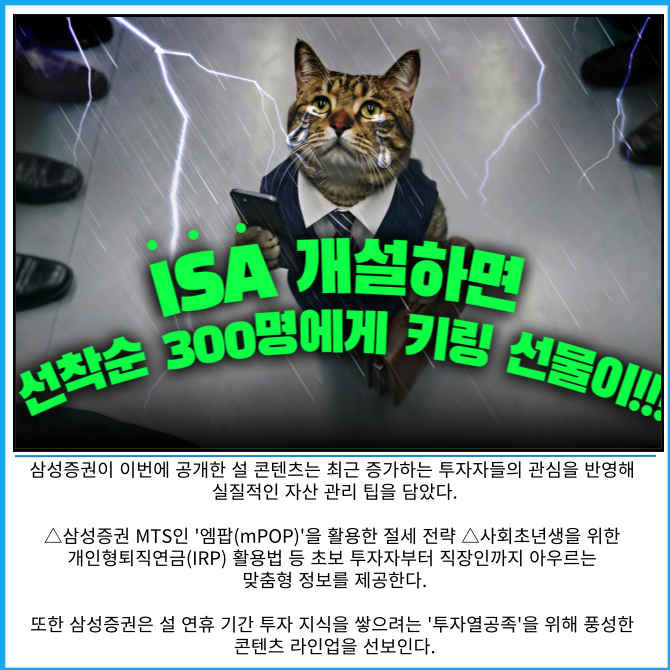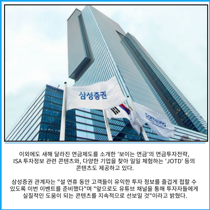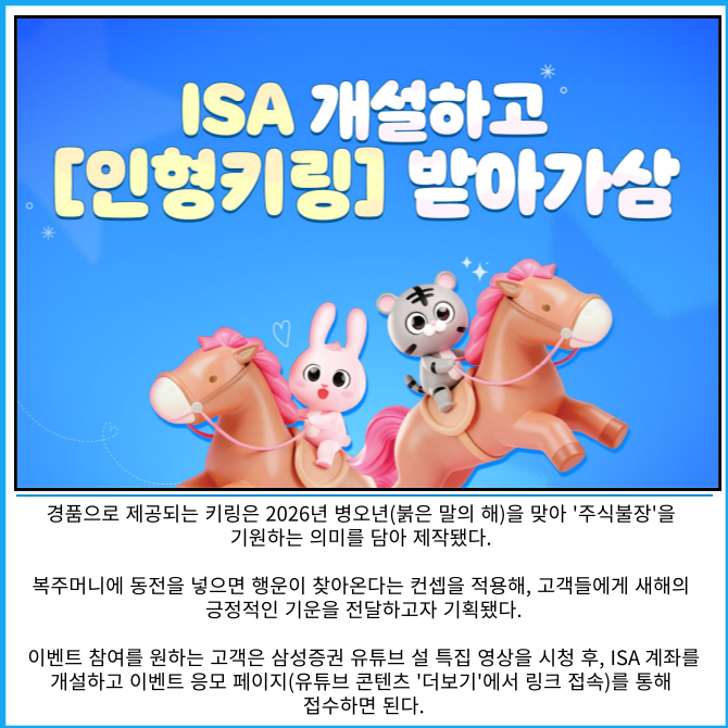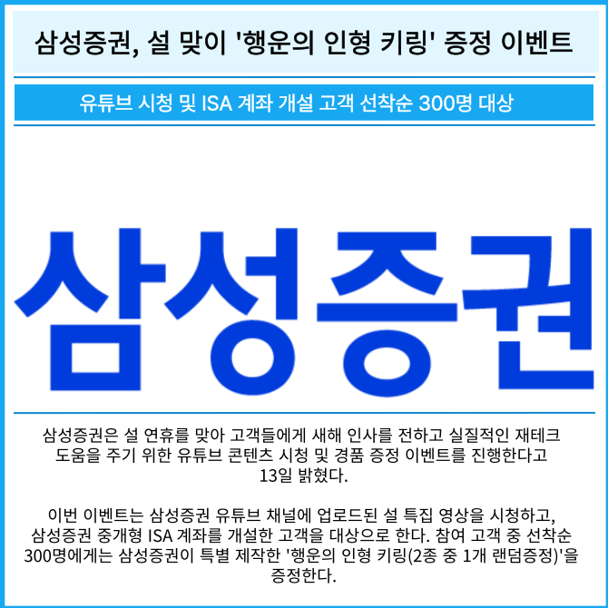 이번 이벤트는 삼성증권 유튜브 채널에 업로드된 설 특집 영상을 시청하고, 삼성증권 중개형 ISA 계좌를 개설한 고객을 대상으로 한다.