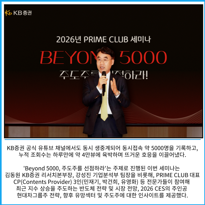 [프라임경제] KB증권은 구독형 투자정보 회원서비스인 PRIME CLUB이 주최한 2026년 투자 세미나가 고객들의 호평 속에 지난 10일 성료했다고 13일 밝혔다.