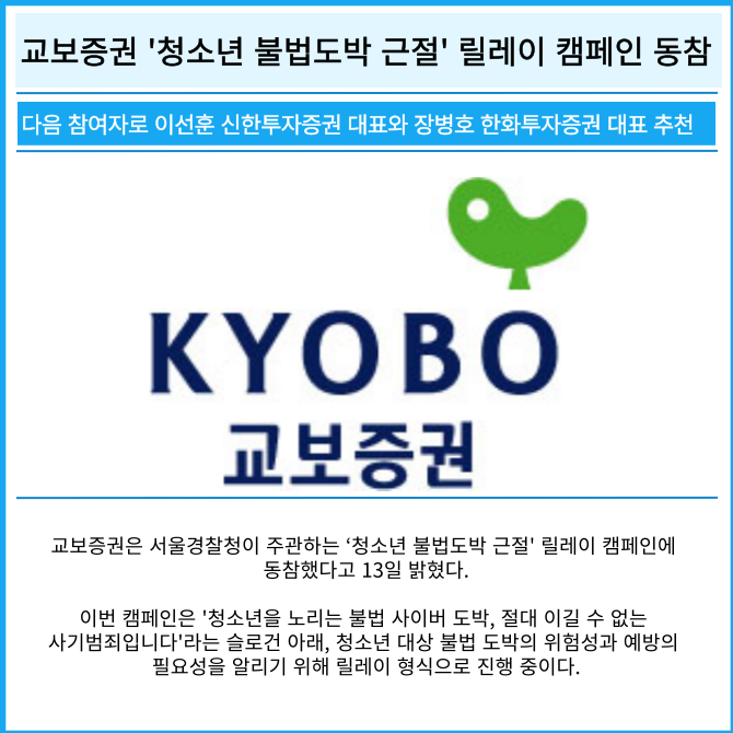 [프라임경제]  교보증권은 서울경찰청이 주관하는 '청소년 불법도박 근절' 릴레이 캠페인에 동참했다고 13일 밝혔다.