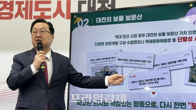 [프라임경제] 대전광역시의 상징 보문산이 20년 침묵을 깨고 다시 움직인다. 이장우 대전시장은 13일 대전시청 브리핑룸에서 '보문산 프로젝트 완결판'을 공식 발표하며 "공허한 선언은 끝났다. 강력한 실행으로 반드시 완수하겠다"고 천명했다. 동시에 국회 행안위에서 의결된 대전·충남 통합 특별법을 두고는 "대전을 팔아먹는 졸속 입법"이라며 강도 높게 비판했다.