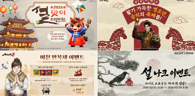 위메이드(112040, 대표 박관호)가 민족 대명절 설날을 맞아 대표 게임 5종에 특별 이벤트를 실시한다. 먼저 '미르의 전설2'는 3월4일까지 '연 날리기'와 '복조리 제작' 이벤트를 진행해 다양한 보상을 지급하고, '미르의 전설3'도 같은 기간 '12원진의 시련'과 '새해기념 담금주' 이벤트를 실시한다. '미르4'는 3월11일까지 '비천 만복제' 출석 이벤트를 통해 '전설 용신기 재료 선택상자' 등을 선물하고, '나이트 크로우'는 3월5일까지 '설 기념 가막이의 특별 출석' 이벤트를 열고 '클레멘스의 쿠폰', '찬란한 수호정령 소환' 등을 제공한다. 마지막으로 '판타스틱 베이스볼'은 14일부터 18일까지 설 특별 '스페셜 릴레이 선물' 이벤트를 진행한다.