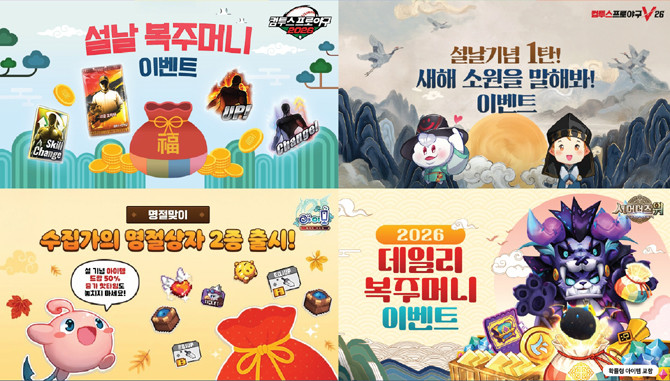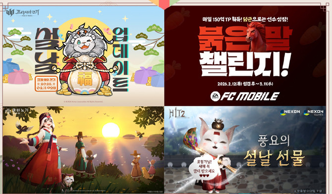 넥슨(공동 대표 강대현·김정욱)은 자사에서 서비스하는 인기 온라인게임 12종에서 설 기념 이벤트를 실시한다. '메이플스토리'는 2월 16일부터 22일까지 '새해 소원을 말해봐' 이벤트를 실시하고, 'EA SPORTS FC™ Online('FC 온라인')'은 14일부터 18일)까지 풍성한 보상을 선물하는 '설날 버닝 이벤트'를 실시한다. '서든어택'에서는 26일까지 '생존전에서 아이템 100개 획득' 등 정해진 3개 일일 미션을 각각 완료할 때마다 'SIG556(IS) 북극곰', 'SG870 초코쿠키' 등의 기간제 아이템 획득 기회를 제공하는 설맞이 생존 버닝 이벤트를 진행하고, '퍼스트 디센던트'에서는 2월 16일부터 19일까지 '설날 온타임 이벤트'를 진행한다. 그밖에 △마비노기 △마비노기 영웅전 △크레이지 아케이드 △아스가르드 △바람의나라 △어둠의전설 △사이퍼즈 △엘소드 등에서도 각각 이벤트를 진행하는 한편 모바일게임 △마비노기 모바일 △메이플스토리M △던전앤파이터 모바일 △프리시아 전기 △'EA SPORTS FC™ Mobile(FC 모바일) △V4 △히트2 등에서도 설맞이 이벤트를 마련해 풍성한 보상을 지급한다.