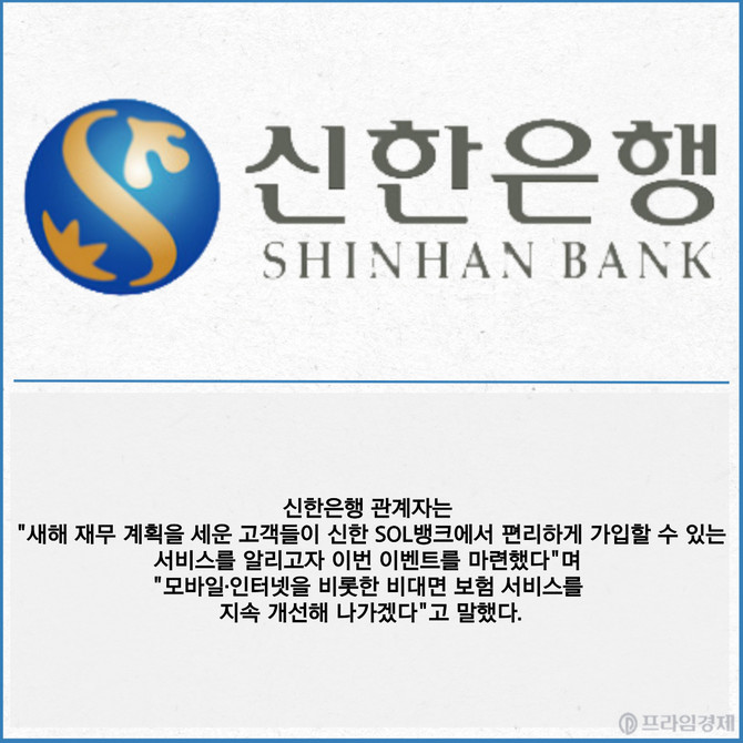 [프라임경제] 신한은행이 내달 17일까지 방카슈랑스 상품을 신한 SOL뱅크에서 가입한 고객을 대상으로 '목표완주! 새해 돈 모으기 결심했다면, 황금빛 인생 프로젝트' 이벤트를 진행한다고 19일 밝혔다.