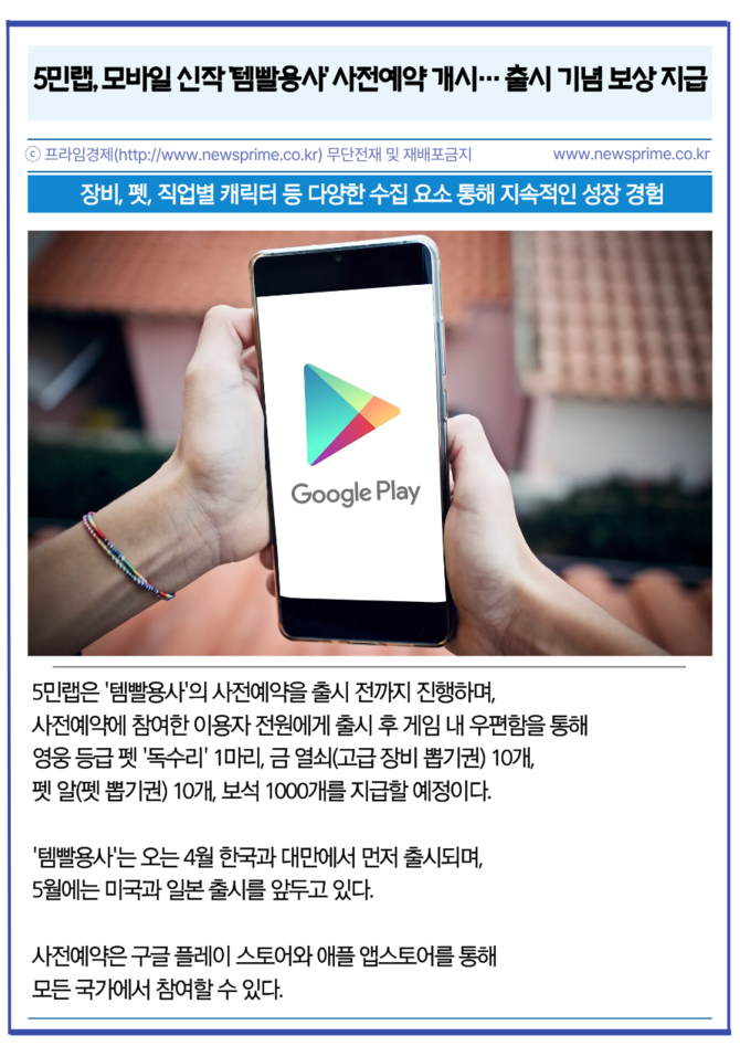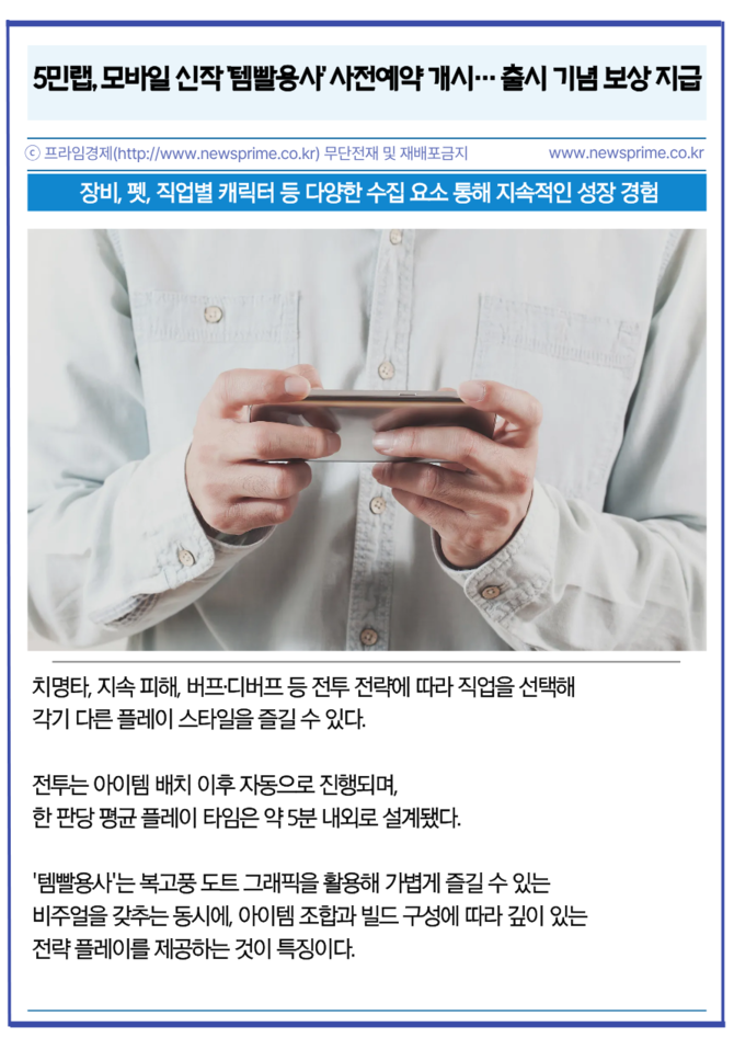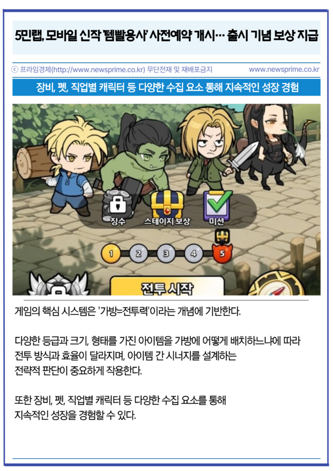 [프라임경제] 크래프톤(259960)의 크리에이티브 스튜디오 5민랩은 신작 모바일 게임 '템빨용사(Overgeared Hero)'의 사전예약을 시작했다고 19일 밝혔다.