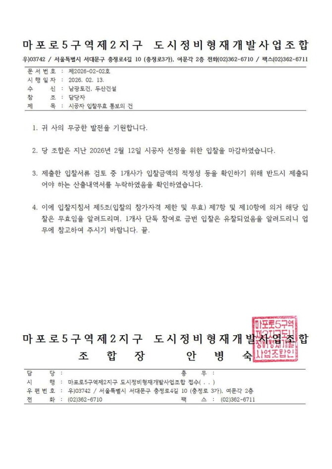 해당 조합은 이와 관련해 설 연휴 직후 재입찰 공고를 내고, 시공사 재선정 절차에 다시 착수한다는 방침이다.