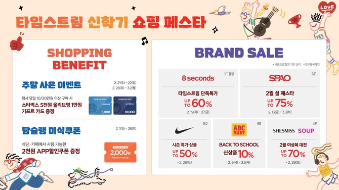 SPA 브랜드에서는 에잇세컨즈가 27일까지 1층 야외행사장에서 타임스트림점 단독 최대 60% 할인전을 연다. 2층 본매장에서는 멤버십 고객 대상 8만원 이상 구매 시 1만원 할인 혜택을 22일까지 제공한다. 스파오는 3월 3일까지 신학기 상품을 최대 75% 할인한다. 미쏘는 22일까지 카카오톡 플러스친구 추가 고객에게 할인 쿠폰을 지급한다.