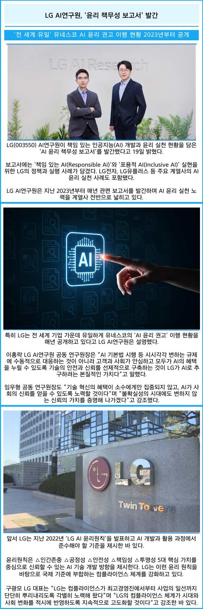 [프라임경제] LG(003550) AI연구원이 책임 있는 인공지능(AI) 개발과 윤리 실천 현황을 담은 'AI 윤리 책무성 보고서'를 발간했다고 19일 밝혔다.