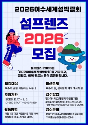 2026여수세계섬박람회조직위원회(이하 '조직위')가 2026여수세계섬박람회 공식 응원단 '섬프렌즈'를 모집한다. 2026여수세계섬박람회에 관심이 있는 국내·외 누구나 참여할 수 있으며, 개인 SNS를 통해 섬박람회의 가치와 소식을 알리는 모집인원은 2026명이다.