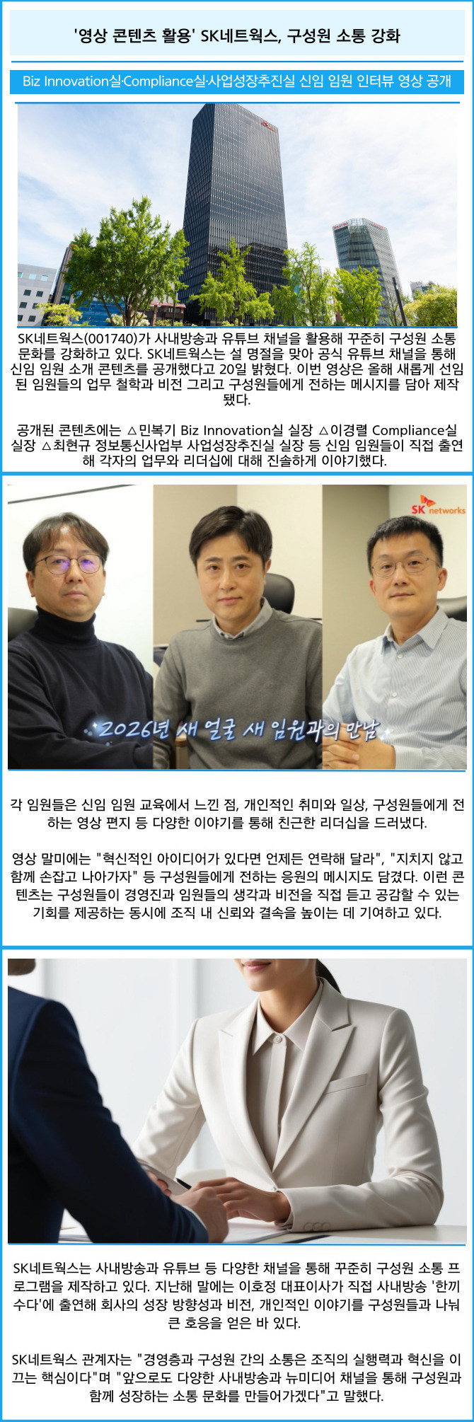 [프라임경제] SK네트웍스(001740)가 사내방송과 유튜브 채널을 활용해 꾸준히 구성원 소통 문화를 강화하고 있다. SK네트웍스는 설 명절을 맞아 공식 유튜브 채널을 통해 신임 임원 소개 콘텐츠를 공개했다고 20일 밝혔다.