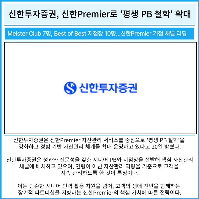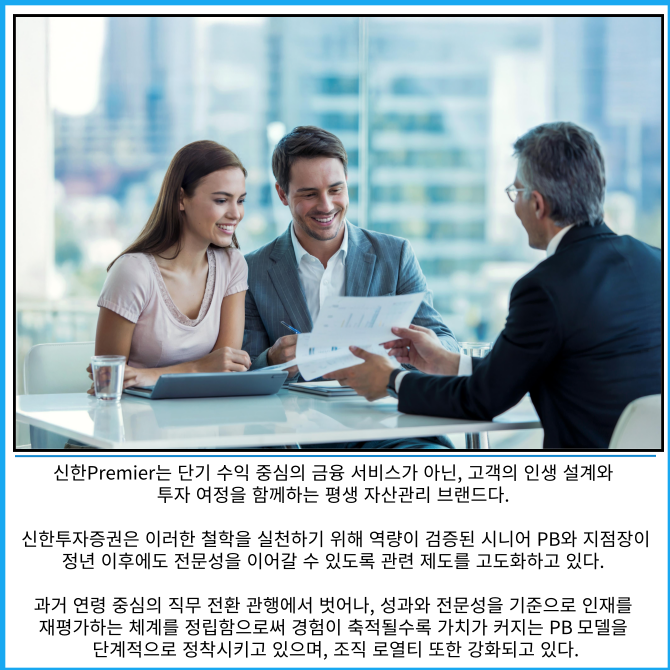 신한투자증권은 성과와 전문성을 갖춘 시니어 PB와 지점장을 선발해 핵심 자산관리 채널에 배치하고 있으며, 연령이 아닌 자산관리 역량을 기준으로 고객을 지속 관리하도록 한 것이 특징이다.