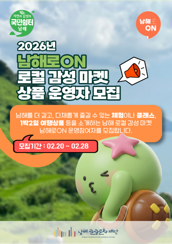 한편 '남해로ON 로컬 감성 마켓 상품 운영자 모집'과 관련한 문의 사항이 있을 재단 관광마케팅팀으로 연락하면 된다.