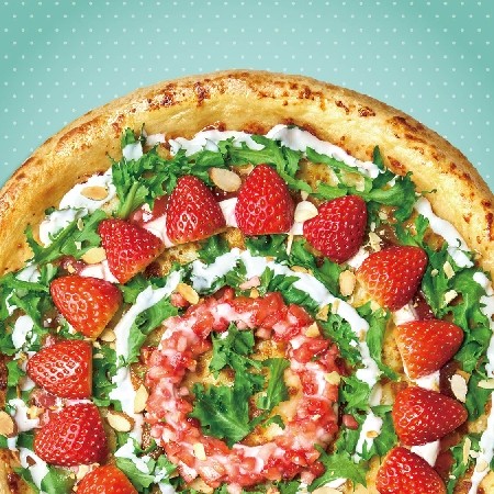 '생딸기듬뿍피자'는 중앙에 스트로베리 챱을 올리고, 가장자리에 생딸기를 원형으로 풍성하게 배치했다. 상큼한 제철 딸기와 진한 크림치즈가 조화를 이룬다.