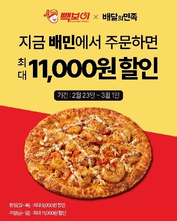 더본코리아(475560)의 피자 포장∙배달 전문 브랜드 빽보이피자가 배달 앱 '배달의민족'과 손잡고 내달 1일까지 일주일간 매일 브랜드 할인 쿠폰을 제공하는 '배짱할인 프로모션'을 진행한다.