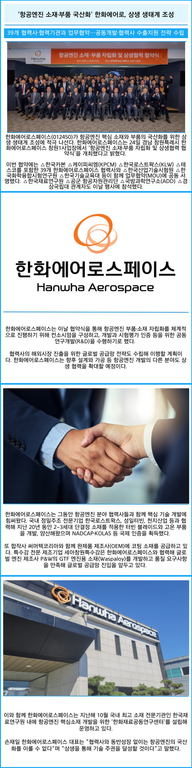 [프라임경제] 한화에어로스페이스(012450)가 항공엔진 핵심 소재와 부품의 국산화를 위한 상생 생태계 조성에 적극 나선다. 한화에어로스페이스는 24일 경남 창원특례시 한화에어로스페이스 창원1사업장에서 '항공엔진 소재·부품 자립화 및 상생협력 협약식'을 개최했다고 밝혔다.