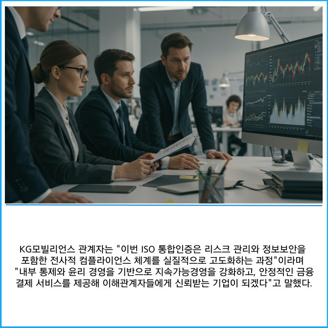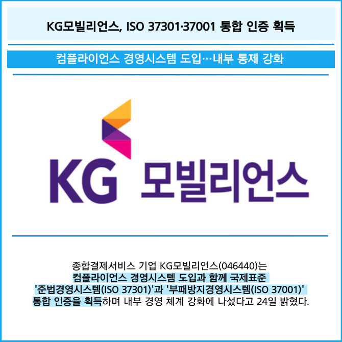 [프라임경제] 종합결제서비스 기업 KG모빌리언스(046440)는 컴플라이언스 경영시스템 도입과 함께 국제표준 '준법경영시스템(ISO 37301)'과 '부패방지경영시스템(ISO 37001)' 통합 인증을 획득하며 내부 경영 체계 강화에 나섰다고 24일 밝혔다.