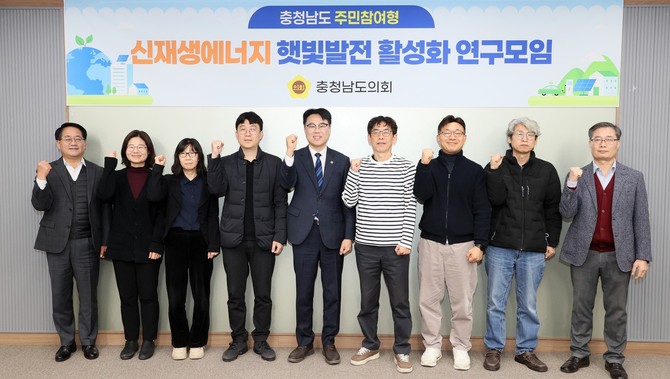 충남도의회 '충청남도 주민참여형 신재생에너지 햇빛발전 활성화 연구모임(대표 정병인)'은 24일 도의회 세미나실에서 발족식과 제1차 회의를 열고 본격적인 활동에 돌입했다.