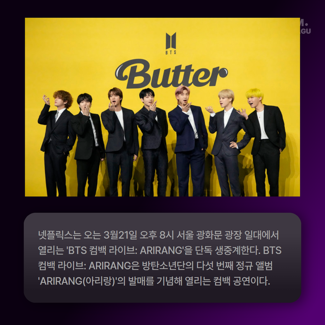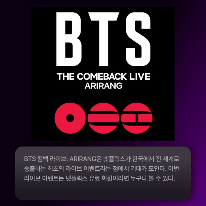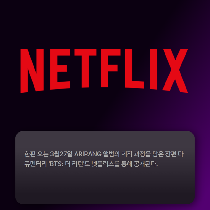 [프라임경제] 넷플릭스는 오는 3월21일 오후 8시 서울 광화문 광장 일대에서 열리는 'BTS 컴백 라이브: ARIRANG'을 단독 생중계한다고 24일 밝혔다.