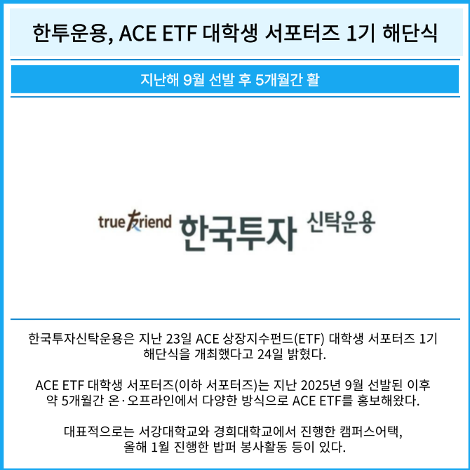 ACE ETF 대학생 서포터즈(이하 서포터즈)는 지난 2025년 9월 선발된 이후 약 5개월간 온·오프라인에서 다양한 방식으로 ACE ETF를 홍보해왔다.