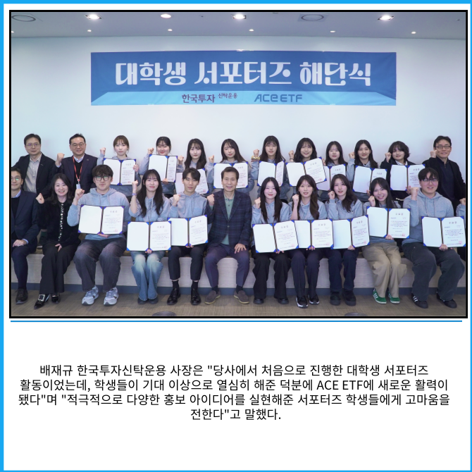[프라임경제] 한국투자신탁운용은 지난 23일 ACE 상장지수펀드(ETF) 대학생 서포터즈 1기 해단식을 개최했다고 24일 밝혔다.