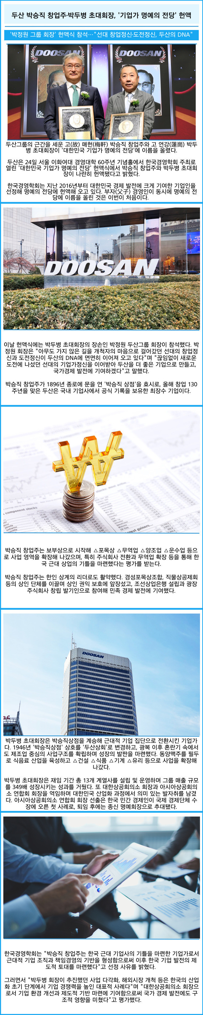 [프라임경제] 두산그룹의 근간을 세운 고(故) 매헌(梅軒) 박승직 창업주와 고 연강(蓮崗) 박두병 초대회장이 '대한민국 기업가 명예의 전당'에 이름을 올렸다.