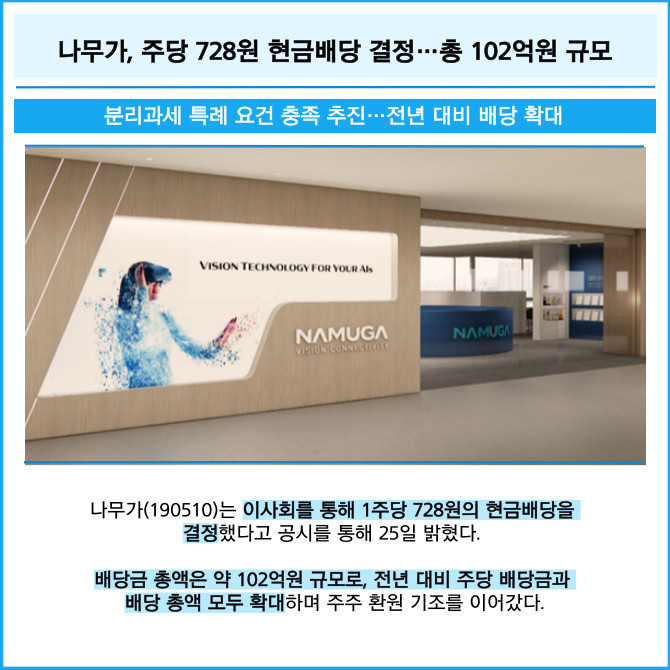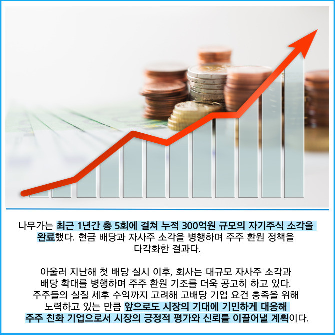 [프라임경제] 나무가(190510)는 이사회를 통해 1주당 728원의 현금배당을 결정했다고 공시를 통해 25일 밝혔다.