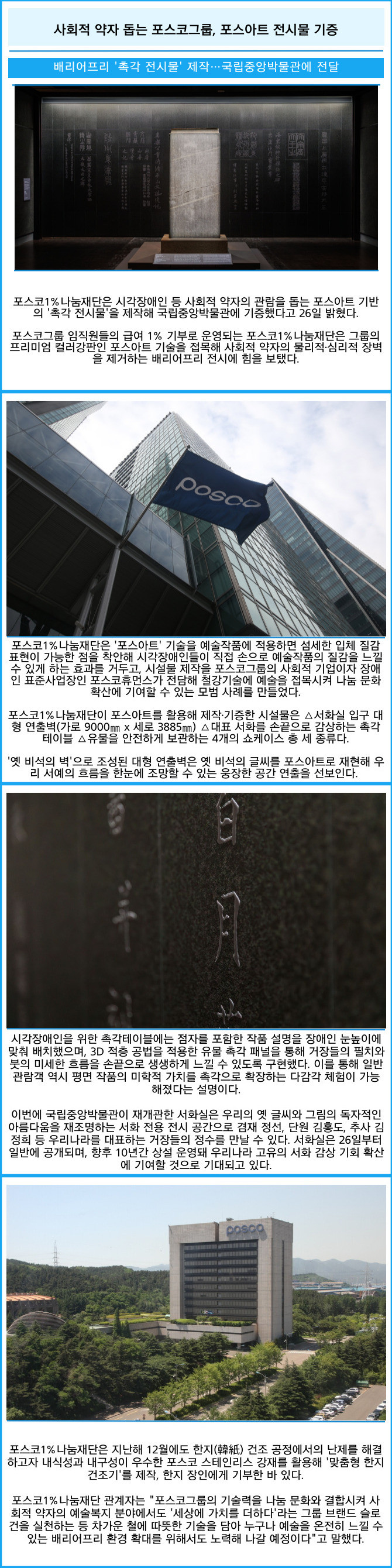 [프라임경제] 포스코1%나눔재단은 시각장애인 등 사회적 약자의 관람을 돕는 포스아트 기반의 '촉각 전시물'을 제작해 국립중앙박물관에 기증했다고 26일 밝혔다.