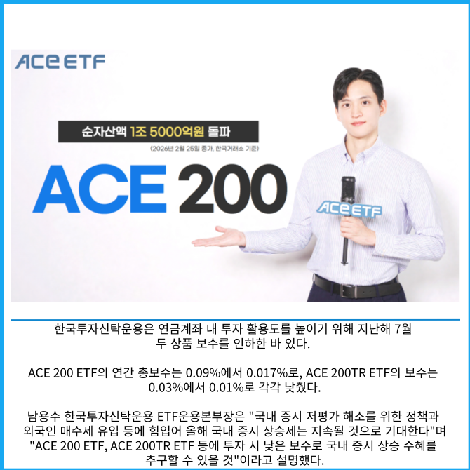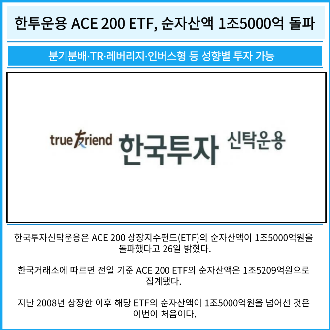 [카드] 한투운용 ACE 200 ETF, 순자산액 1조5000억 돌파