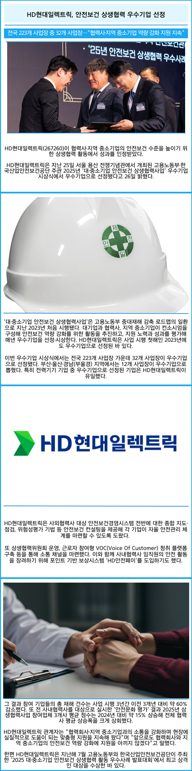 [프라임경제] HD현대일렉트릭(267260)이 협력사·지역 중소기업의 안전보건 수준을 높이기 위한 상생협력 활동에서 성과를 인정받았다.