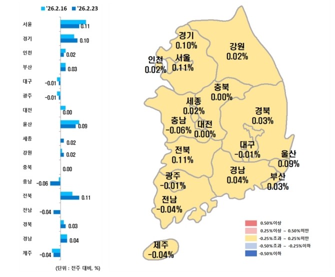상승 자체는 이어졌지만 속도는 눈에 띄게 둔화한 분위기다. 실제 서울 상승률은 △2월 첫째 주 0.27% △둘째 주 0.22% △셋째 주 0.15% △넷째 주 0.11%로, 4주 연속 오름폭이 줄었다. 전주(0.15%)와 비교하면 상승폭이 0.04%p(포인트) 축소된 것이다.