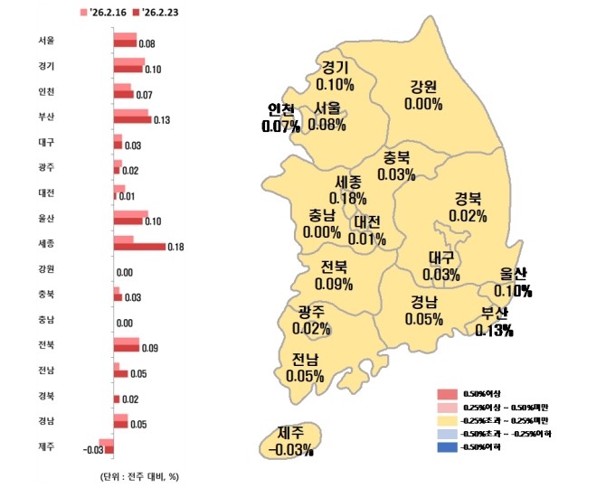 비수도권은 0.02% 상승했으며 △5대 광역시 △세종 △8개 도 모두 0.02% 상승으로 집계됐다.