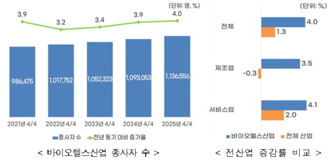 [프라임경제] 지난해 4분기 바이오헬스산업 종사자가 113만7000명으로 집계되며 전년 동기 대비 4.0%(4만4000명) 증가한 것으로 나타났다. 제조업 전반의 고용이 0.3% 감소로 전환된 상황에서도 바이오헬스제조업은 3.5% 늘어나며 비교적 안정적인 성장 흐름을 이어갔다. 의료서비스업 역시 4.1% 증가해 전체 서비스업 증가율(2.0%)을 웃돌았다.