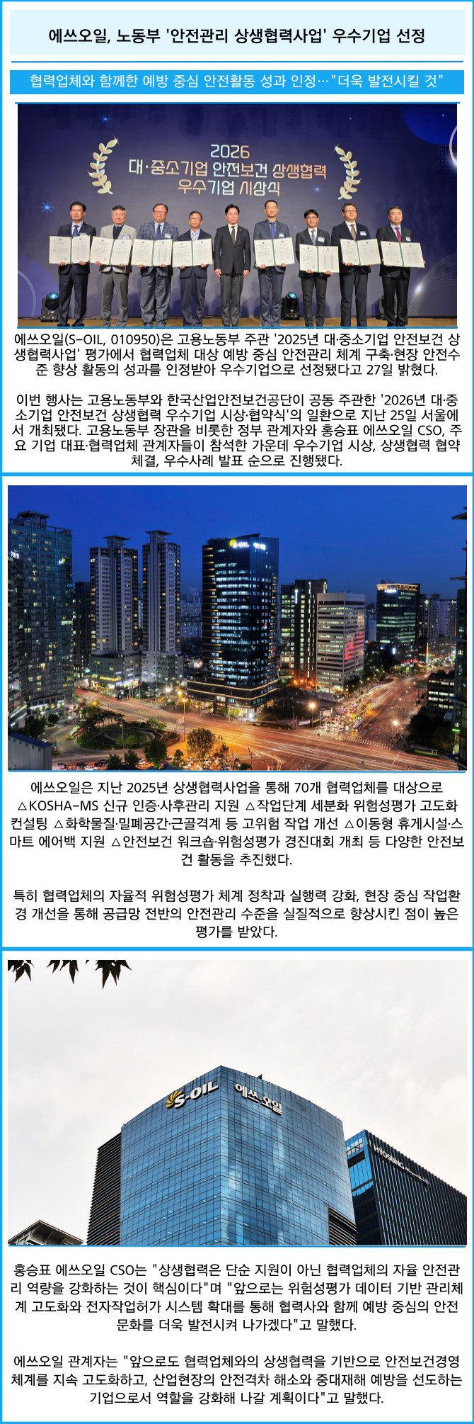 [프라임경제] 에쓰오일(S-OIL, 010950)은 고용노동부 주관 '2025년 대·중소기업 안전보건 상생협력사업' 평가에서 협력업체 대상 예방 중심 안전관리 체계 구축·현장 안전수준 향상 활동의 성과를 인정받아 우수기업으로 선정됐다고 27일 밝혔다.