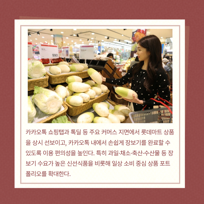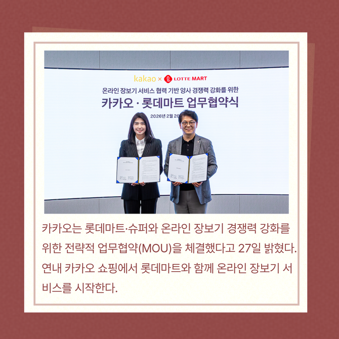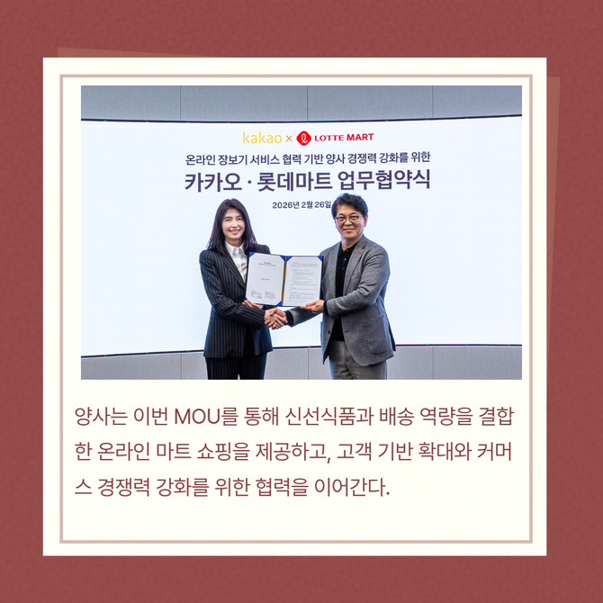 [프라임경제] 카카오(035720)는 롯데마트·슈퍼와 온라인 장보기 경쟁력 강화를 위한 전략적 업무협약(MOU)을 체결했다고 27일 밝혔다.