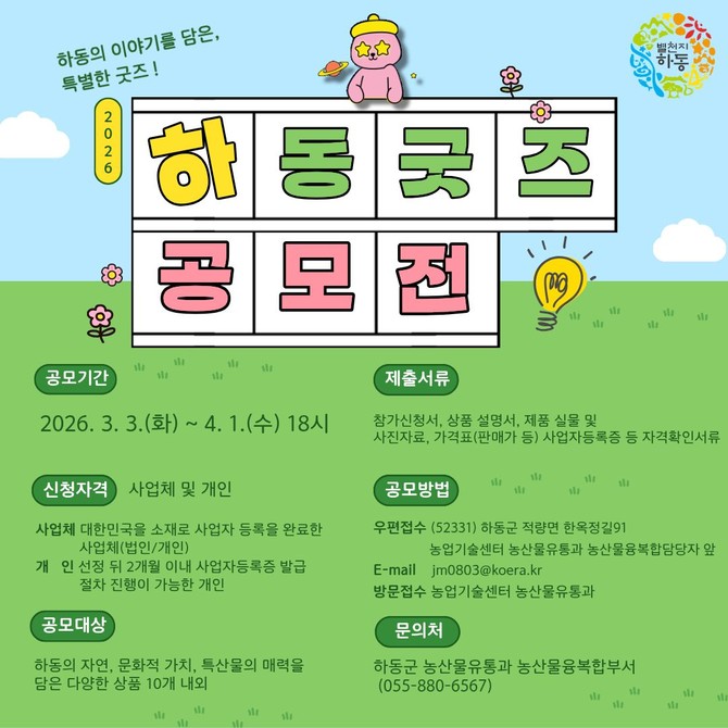 [프라임경제] 하동군이 지역 고유의 자연과 문화, 특산 자원의 가치를 담은 창의적이고 실용적인 상품을 발굴하기 위해 '2026 하동굿즈 공모'를 추진한다.