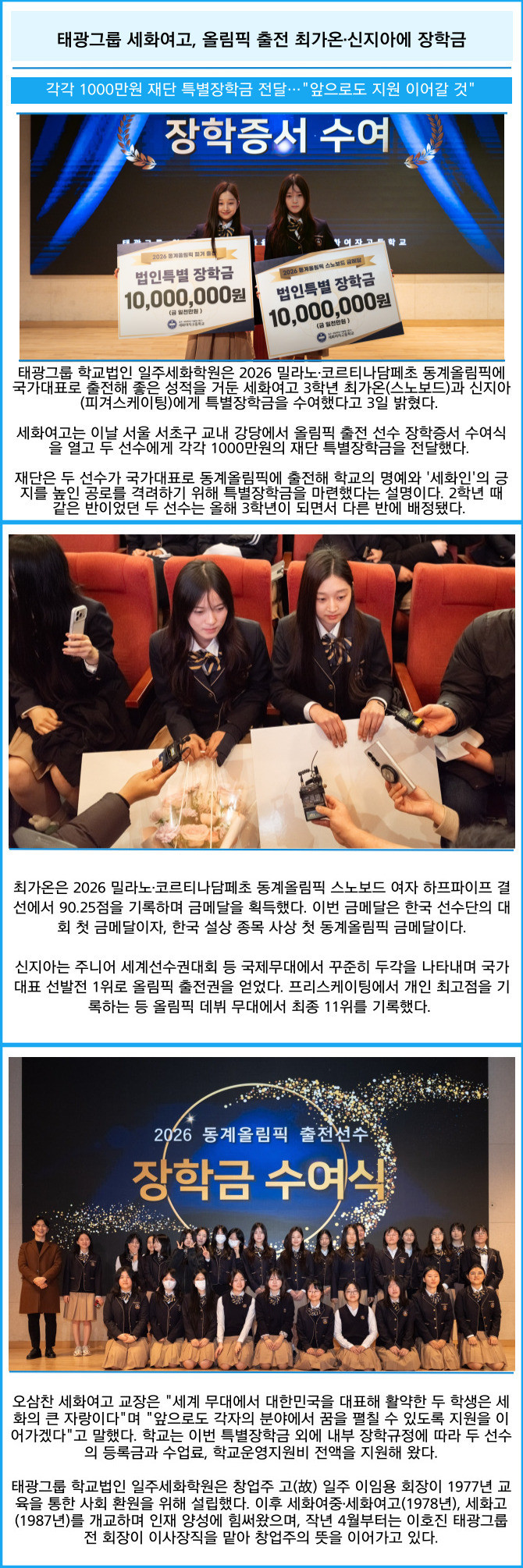 [프라임경제] 태광그룹 학교법인 일주세화학원은 2026 밀라노·코르티나담페초 동계올림픽에 국가대표로 출전해 좋은 성적을 거둔 세화여고 3학년 최가온(스노보드)과 신지아(피겨스케이팅)에게 특별장학금을 수여했다고 3일 밝혔다.