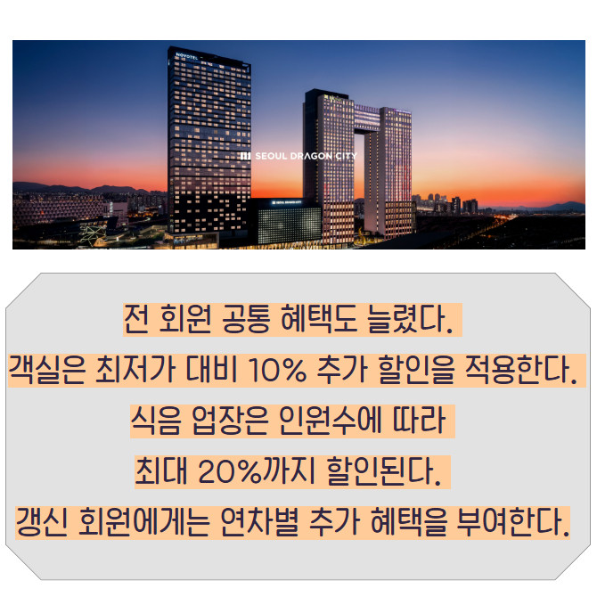 이번 개편의 핵심은 혜택의 이원화다. 객실 중심과 식음 중심 혜택을 명확히 구분했다는 게 호텔 측 설명. 구체적으로 특정 레스토랑 지정 방식에서 금액권 중심으로 구조를 바꿨다. 서울드래곤시티 내 10여개 식음 매장에서 취향에 따라 자유롭게 선택할 수 있다.