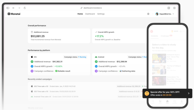 하얀마인드는 다수의 모바일 앱 개발사와 진행한 기술검증(PoC) 및 운영 환경에서 성과를 확인했다는 입장이다. 회사 측에 따르면 교육·피트니스·유틸리티 등 다양한 앱 카테고리에서 모네타이 적용 이후 신규 사용자당 평균 매출(ARPU)이 최대 80% 이상 증가하는 사례를 확보했다.