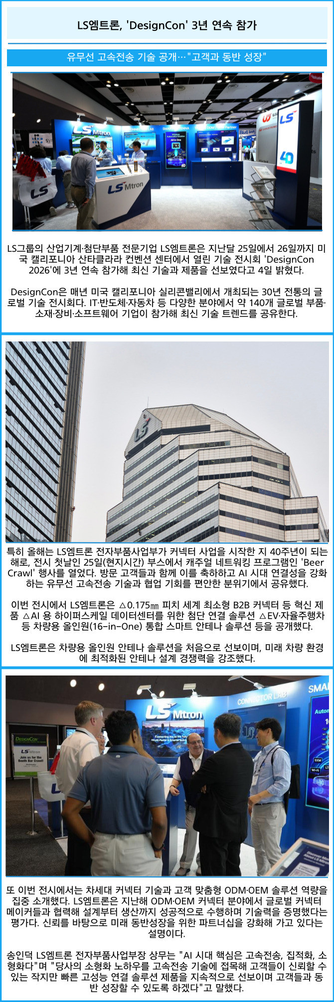 [프라임경제] LS그룹의 산업기계·첨단부품 전문기업 LS엠트론은 지난달 25일에서 26일까지 미국 캘리포니아 산타클라라 컨벤션 센터에서 열린 기술 전시회 'DesignCon 2026'에 3년 연속 참가해 최신 기술과 제품을 선보였다고 4일 밝혔다.