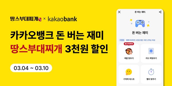 이번 프로모션은 2026년 3월4일부터 3월10일까지 7일간 진행된다. '돈 버는 재미'의 '색깔 맞추기' 미션을 3회 클리어한 고객을 대상으로 땅스부대찌개의 '짬뽕부대찌개 3000원 할인 쿠폰'을 선착순으로 제공하는 행사다.