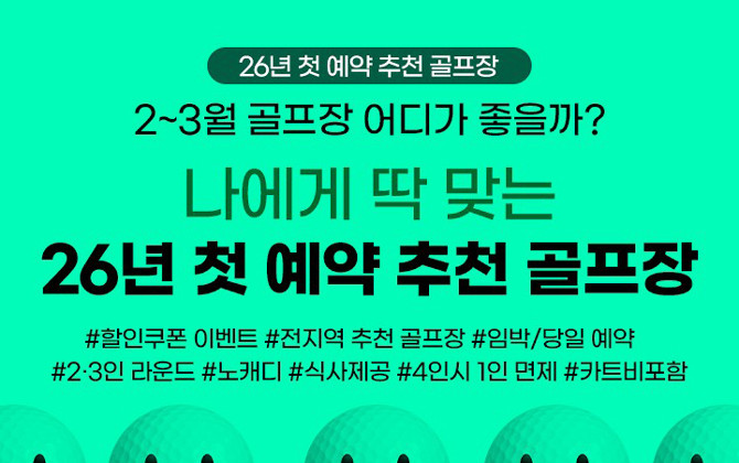 스마트스코어가 3월 골프 예약 수요 증가에 맞춰 골프장 별 혜택을 한눈에 비교할 수 있도록 골프 예약 기능을 강화하고, 선결제 할인과 임박 특가, 2·3인 라운드 및 노캐디 골프장 기획전을 확대 운영한다. 먼저 2026년 첫 라운드를 준비하는 골퍼들을 위한 선결제 프로모션을 진행한다. 2~3월 골프장 티타임을 선결제 예약하면 다음 번 선결제 골프장 예약 시 사용 가능한 1만원 할인 쿠폰이 제공된다. 예약 수요가 높은 인기 골프장 중심으로 프로모션이 구성됐다. 지역 특성을 기반으로 한 큐레이션 콘텐츠도 강화했다. 지형과 평균 기온, 코스 컨디션 등의 정보를 함께 제공하며 해당 시즌에 적합한 골프장을 추천하는 방식으로, 거주지 인근 골프장을 찾는 이용자뿐 아니라 타 지역 원정 라운드를 계획하는 골퍼들에게 단순 가격 비교를 넘어 꼭 필요한 정보를 제공하는 것이 특징이다. 아울러 △당일·임박 예약 특가 기획전 확대 운영 △2·3인 라운드 상품 강화 △노캐디 골프장 정보개선 △각 골프장 자체 진행 중인 다양한 이벤트 확인 등 다양한 골프 예약 기획전을 마련했다.
